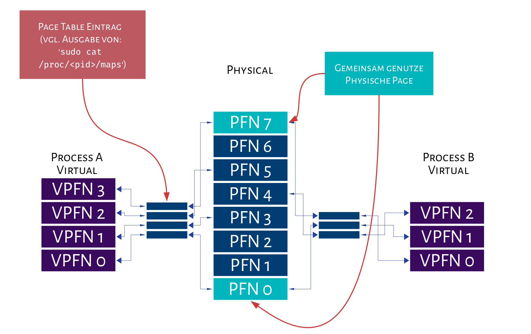 - Copy on Write: Sobald in einen eingelagerten Bereich geschrieben wird, erstellt der Kernel eine Kopie im physical Memory